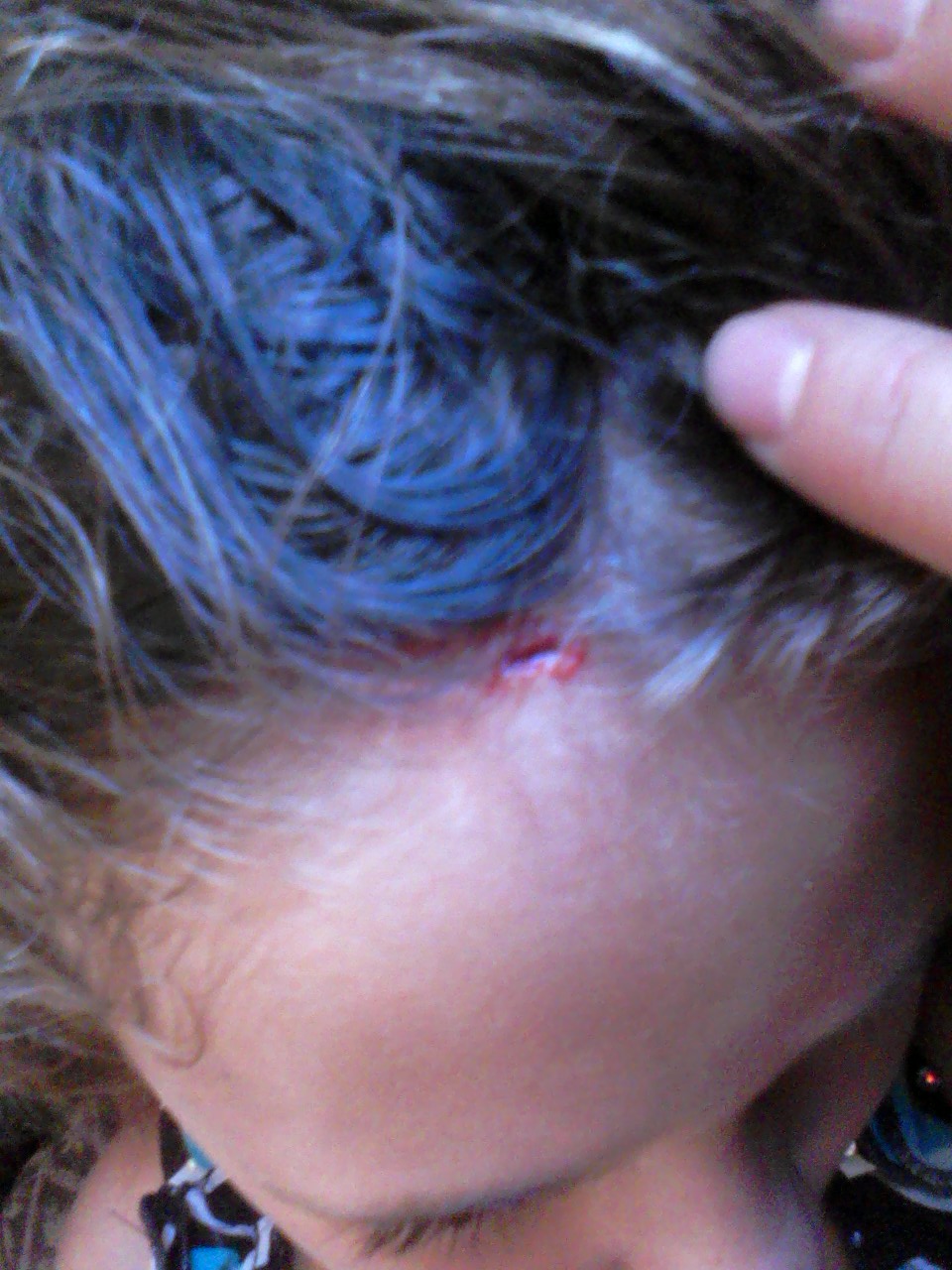 K bashed her head and walked out to find me on the porch, with blood over her face. It was a little scary... but we put on our big girl pants and dealt with it. It didn't really actually even hurt her... she just more reacted to our reactions... it was kinda gross.